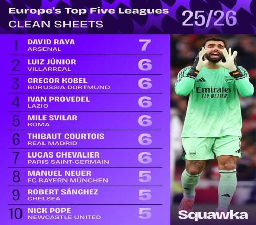 数据统计机构Squawka统计出本赛季截至目前五大联赛门将零封榜,戴维-拉亚7次零封居首。